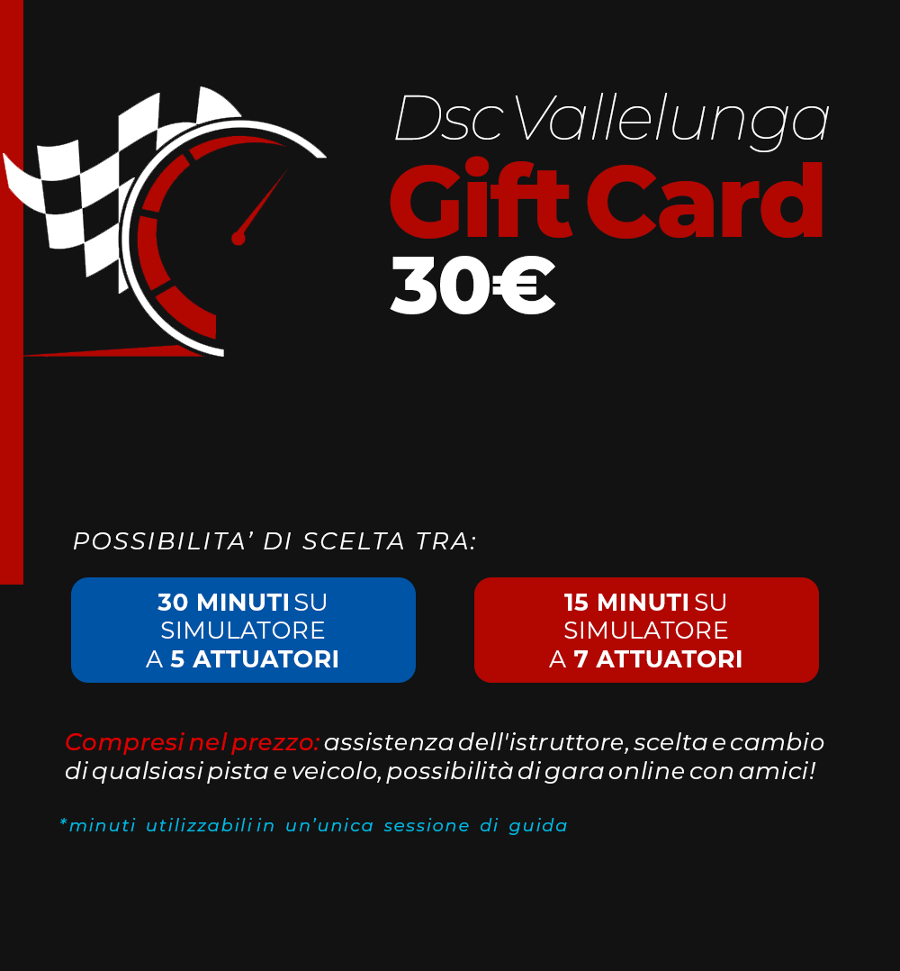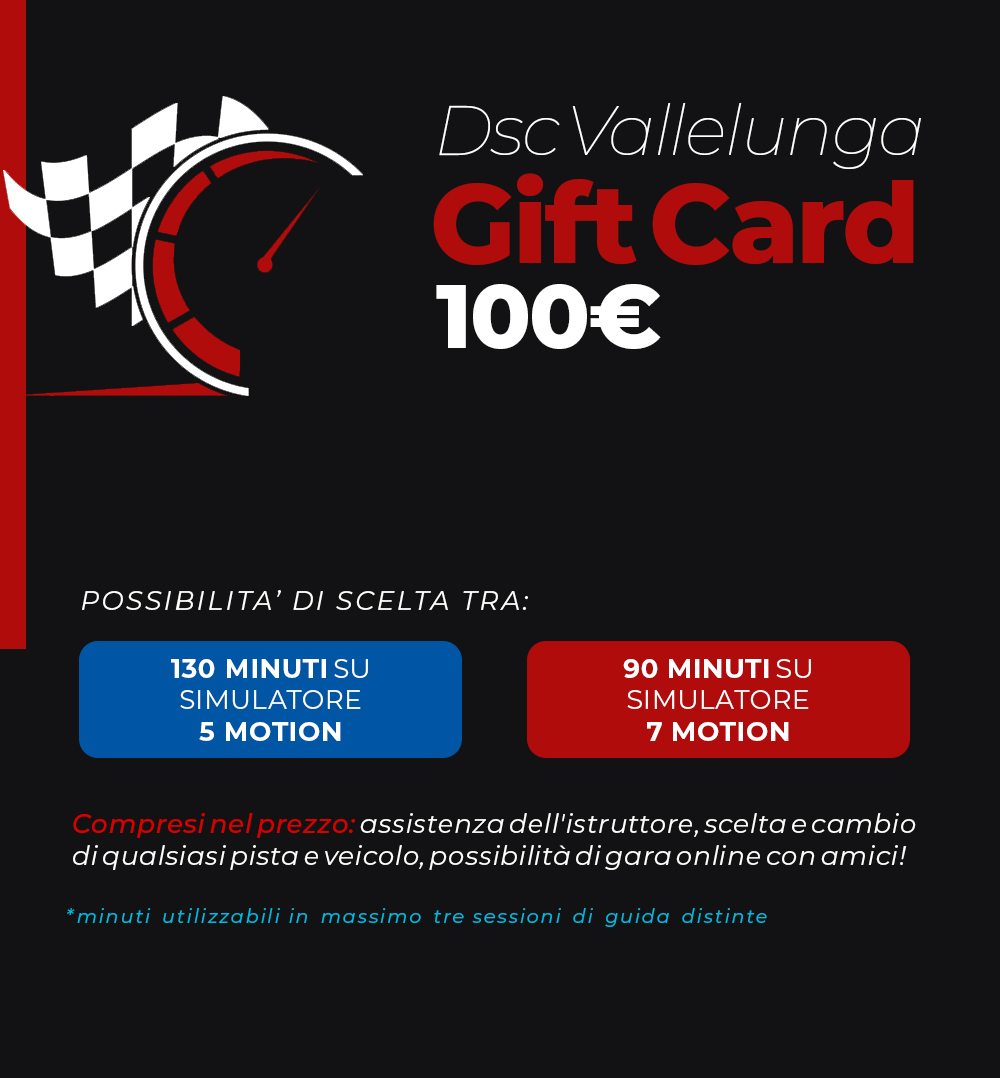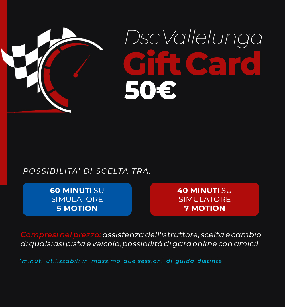 Scegli una delle nostre gift card e regala un’esperienza di guida mozzafiato al Driving Simulation Center Vallelunga, un dono indimenticabile solo per veri coraggiosi!